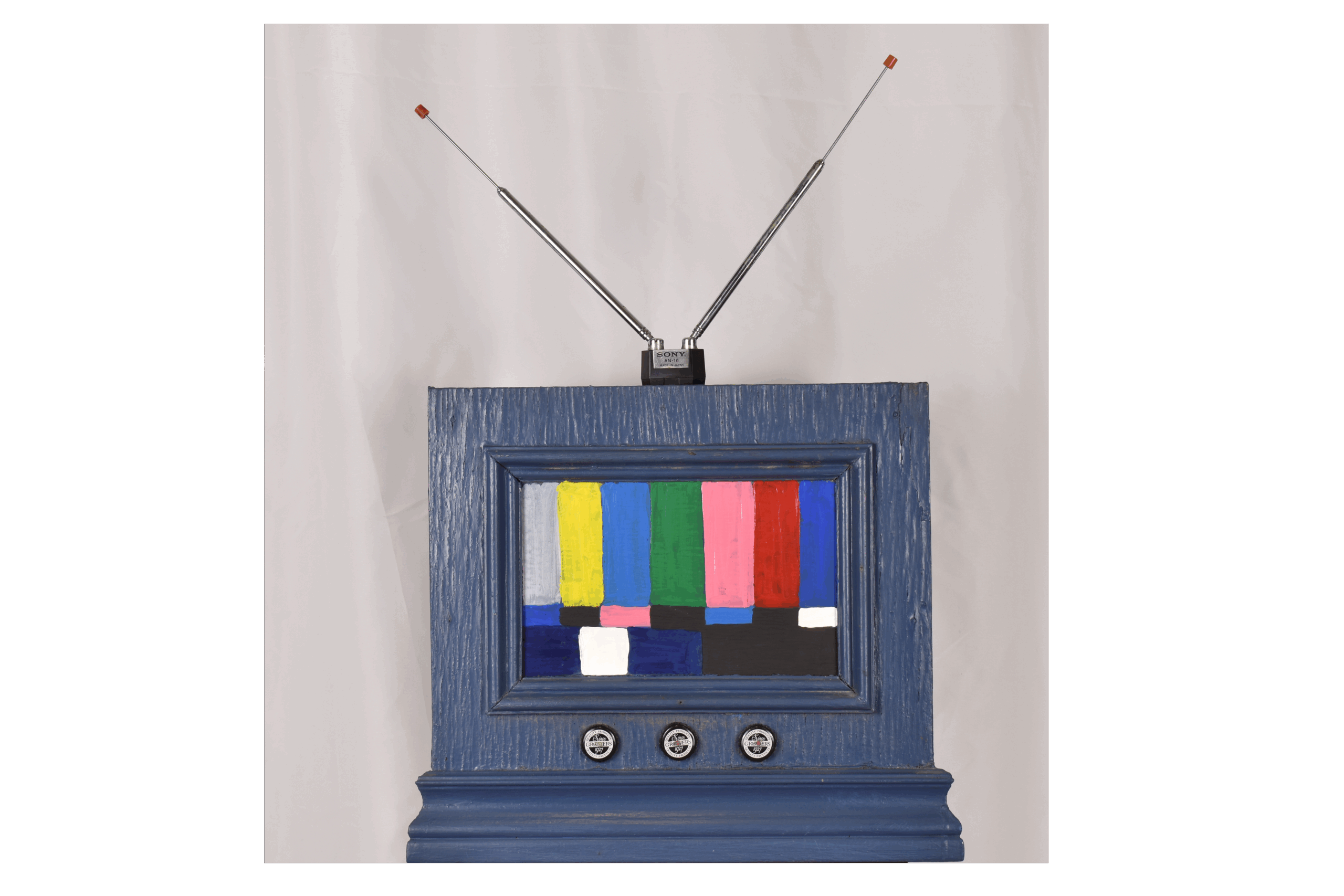 At its center is the brightly painted test pattern, that familiar after-hours image once seen when broadcasts ended for the night. Rendered in bold stripes of color, it captures the essence of an everyday cultural object but with a direct, hand-painted naivety that feels both nostalgic and endearing. The polychromed surface, simple geometry, and tactile materials all highlight the folk tradition of reimagining conventional objects in more personal, inventive ways.
