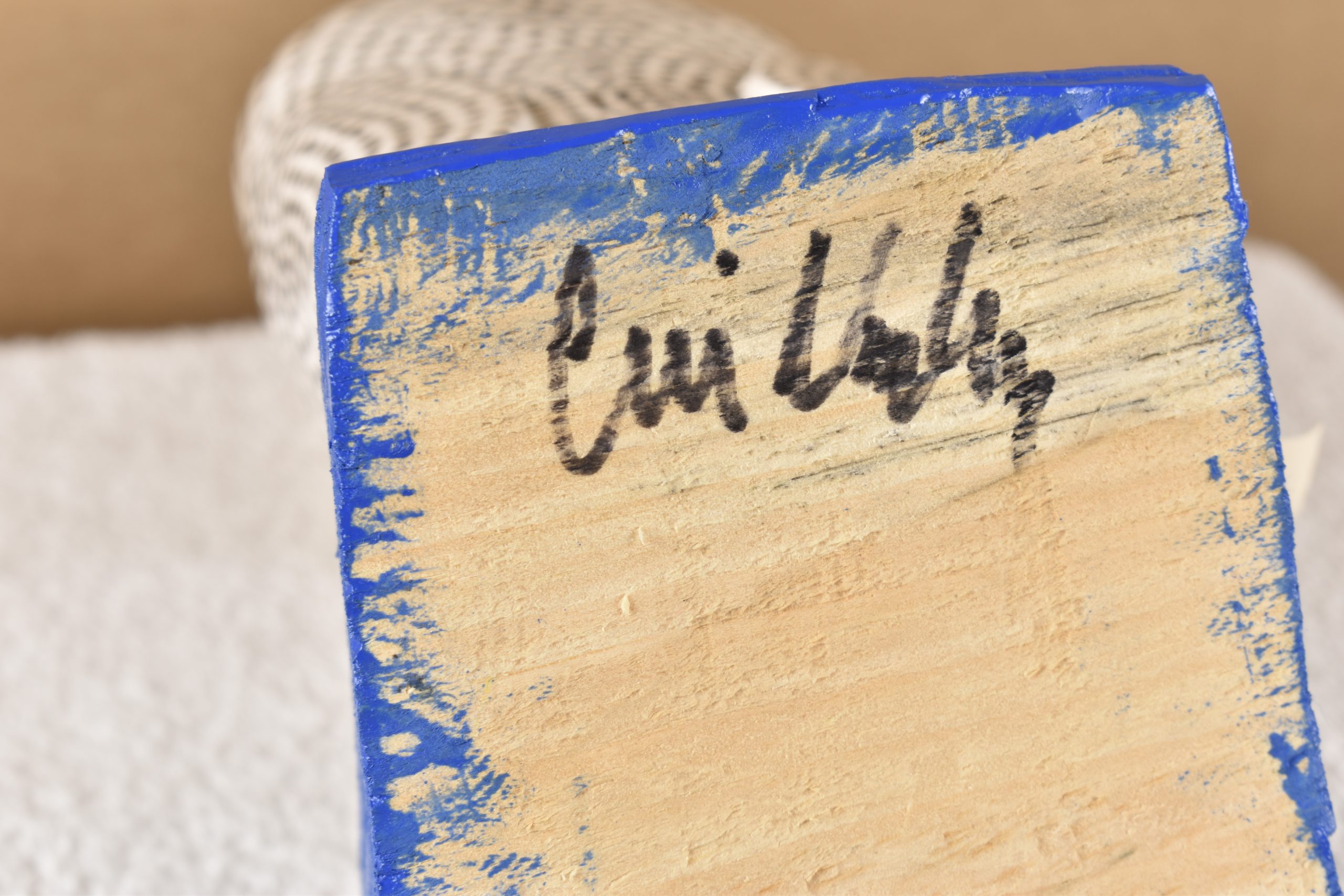 This striking carved owl by Nova Scotia folk artist Craig Naugler is perched confidently on a bright, angled blue base. The owl’s surface is meticulously covered in hand-painted black dots over a white body, creating a bold, graphic pattern that vibrates with energy. Its beak and eyes, rendered in a vivid yellow, provide a sharp visual contrast, enhancing the creature’s alert, almost humorous expression. The angular base adds a sculptural punch, emphasizing Naugler’s flair for turning simple forms into dynamic, character-filled works. Signed by the artist, this piece embodies the playful spirit and bold craftsmanship characteristic of Naugler’s evolving folk tradition.
