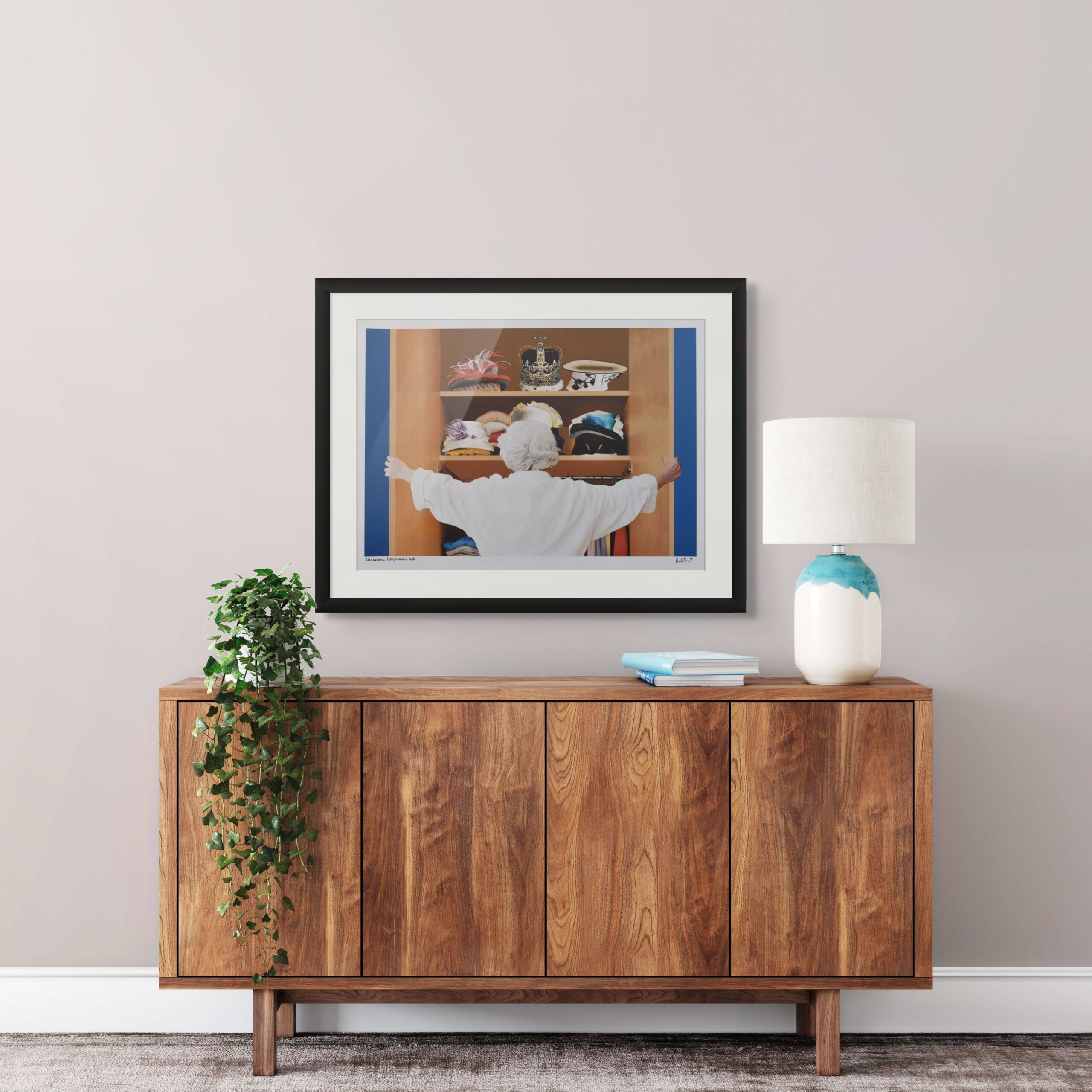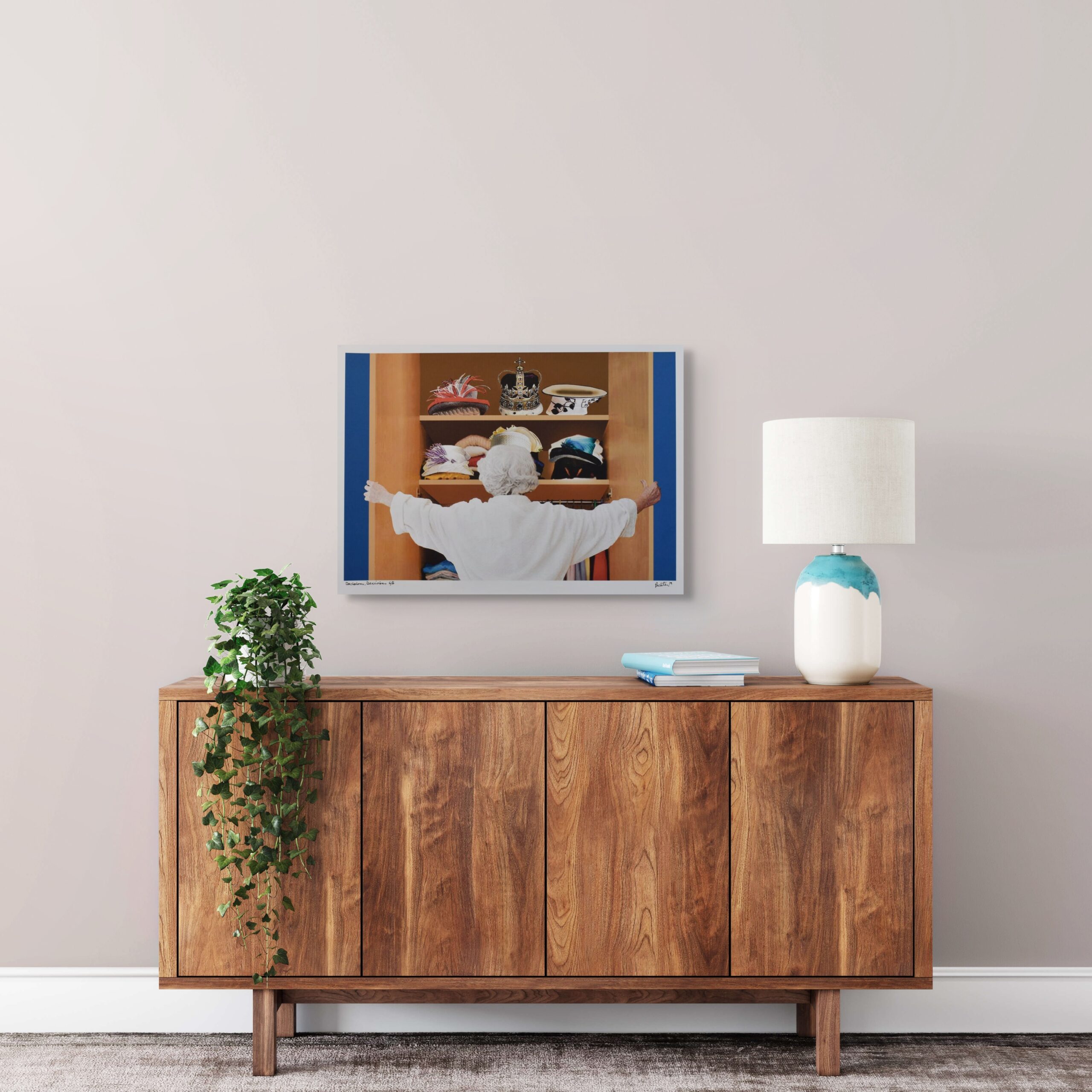 From his earliest whimsical depictions of the Queen seated atop a moose to more playful interpretations, Pachter has reimagined the Monarch in a variety of creative settings. In this particular print reproduction, the Queen is seen opening a wardrobe filled with her signature hats—her crown prominently displayed among them. The scene playfully suggests a moment of indecision, as if Her Majesty is pondering, “What to wear?” This piece is part of a series exploring Pachter’s iconic royal imagery.