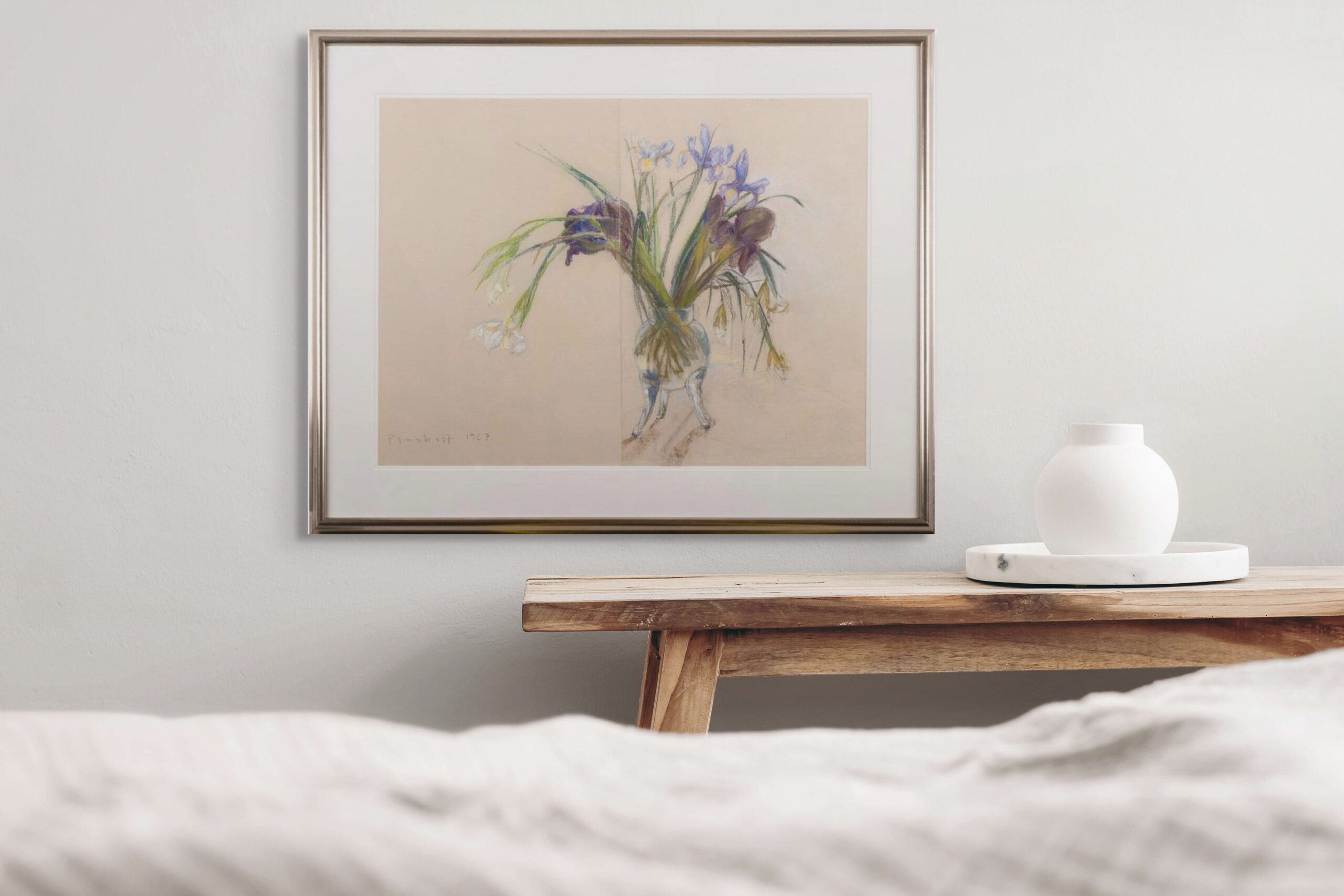 In Iris #2, Canadian artist Joseph Plaskett brings a cluster of irises to life through soft layers of luminous pastel. With expressive strokes and a palette that hums with subtle color, the composition captures the elegance and quiet vitality of these blooms. Plaskett’s sensitivity to light and form transforms a simple floral arrangement into a lyrical study in atmosphere and presence.