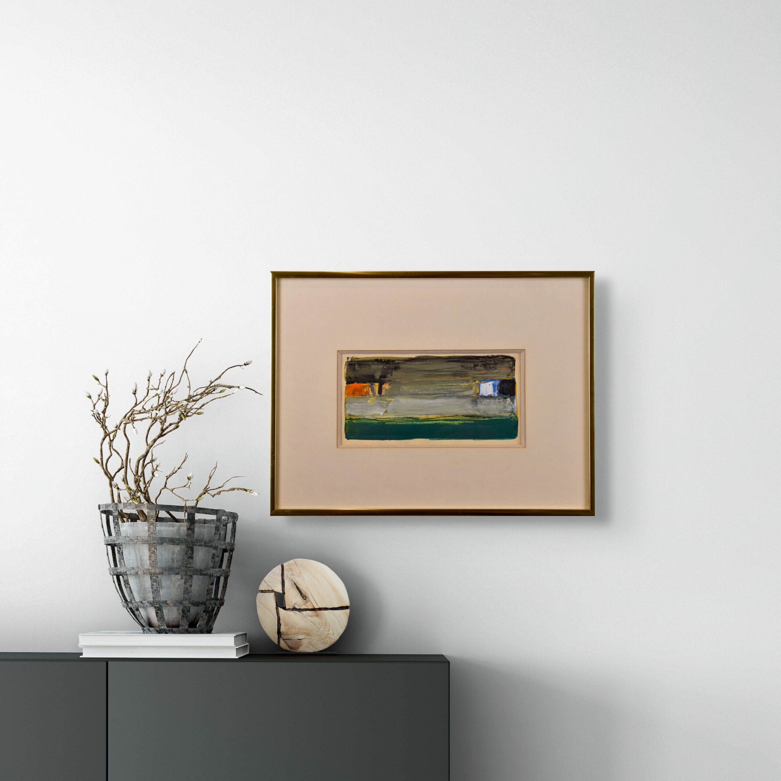 A luminous study in horizontal tension and tonal layering, this small-scale abstract composition captures José Díaz’s gift for quiet balance. Earthy green and slate tones drift into warmer hues—rust, ochre, and black—suggesting both landscape and memory. Hints of architectural geometry emerge from the painterly haze, evoking Díaz’s ability to collapse time and place into emotionally resonant form.