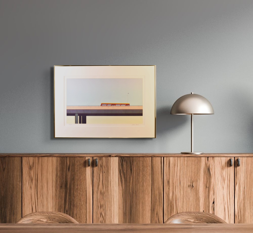 This work by John Ward is a lithograph, a medium well-suited to his precise and deliberate visual language. The scene—a solitary red topped bus gliding across an elevated highway—exudes clarity and control. Ward uses the lithographic process to emphasize clean lines, gentle tonal shifts, and architectural simplicity. The pale gradient of sky, balanced by the structural rhythm of the overpass, creates an atmosphere of quiet restraint.