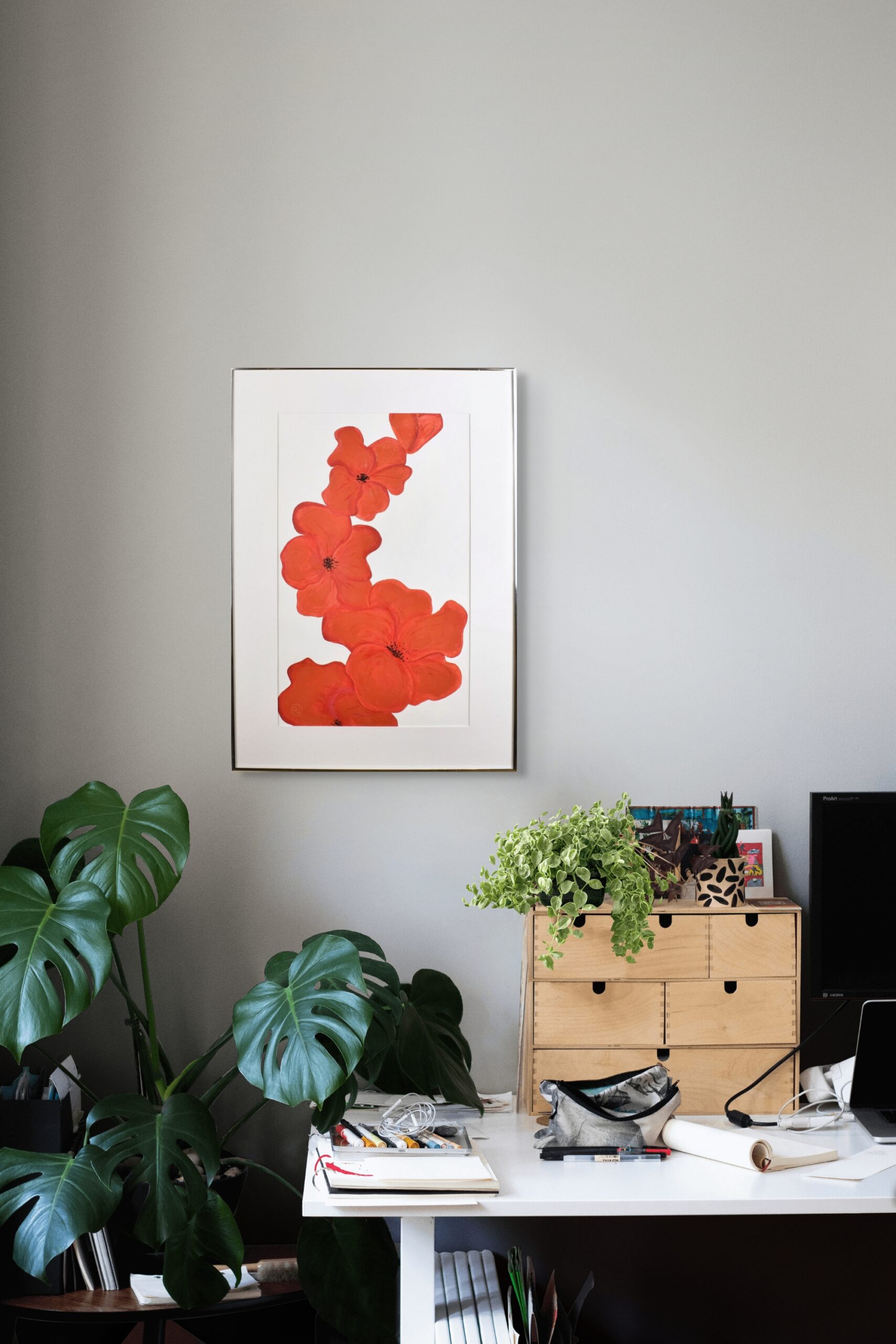 With echoes of Georgia O’Keeffe’s floral magnifications and the minimalist pop of contemporary graphic design, the composition walks a fine line between botanical intimacy and decorative boldness. Each petal, defined yet slightly abstracted, pulses with energy, while the negative space lends the work a modern, airy balance.