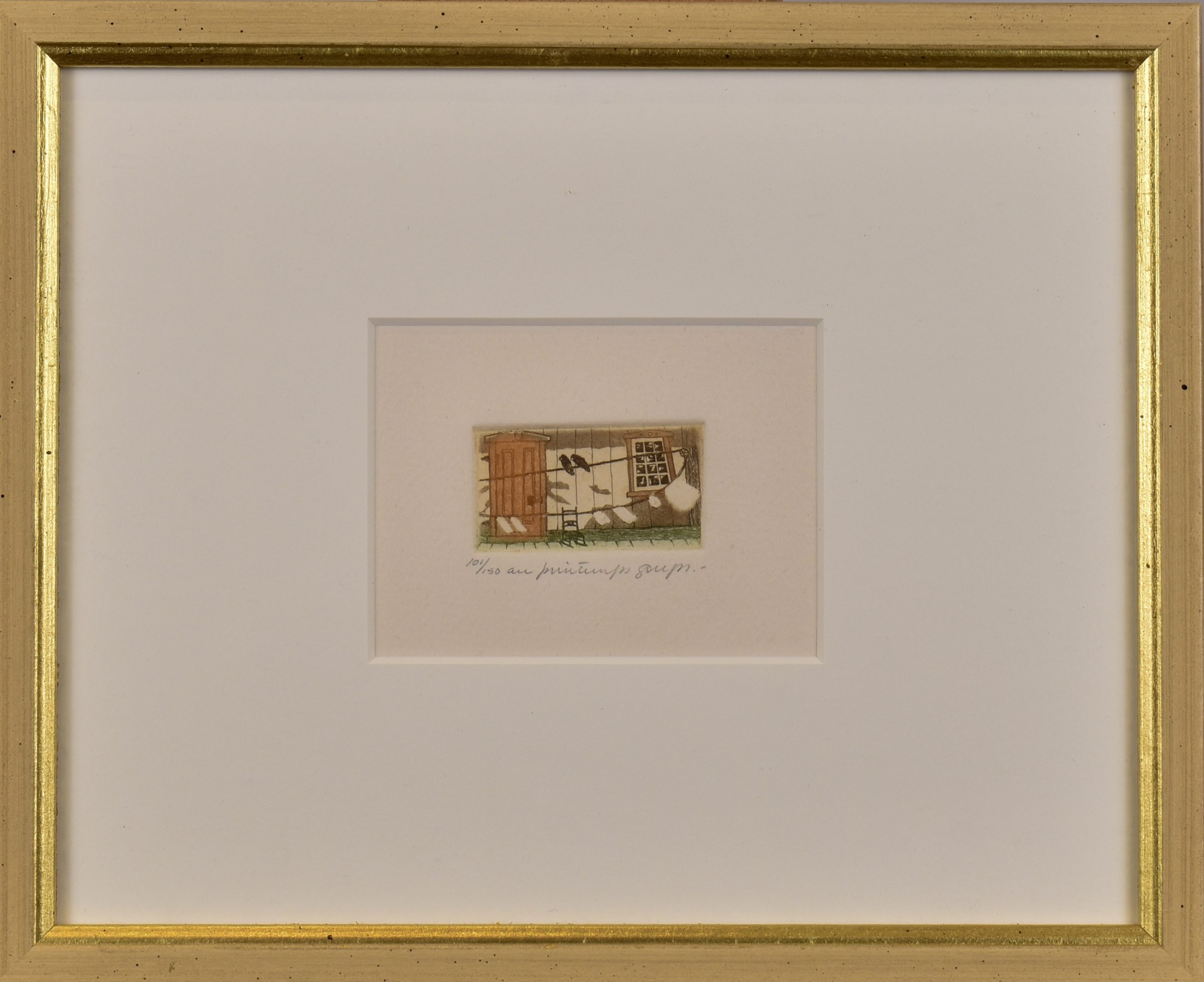A quiet, poetic miniature, Au Printemps (“In Spring”) captures the intimate charm of a rustic moment—a bird perched by a weathered window, the last patches of snow melting along a cottage wall. Rendered in fine etching with subtle hand-coloring, the scene invites the viewer to lean in and linger, revealing its narrative through intimacy and restraint.