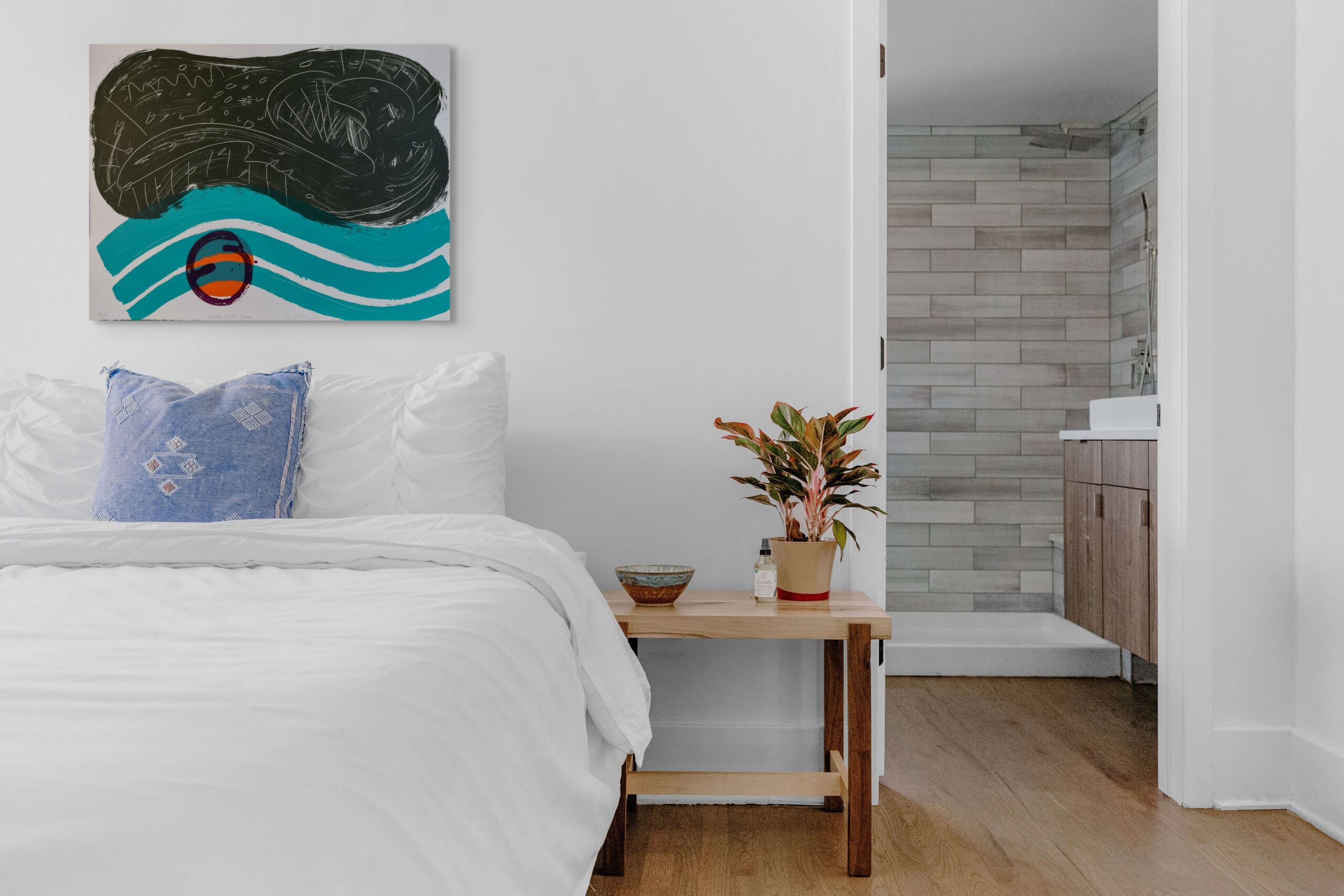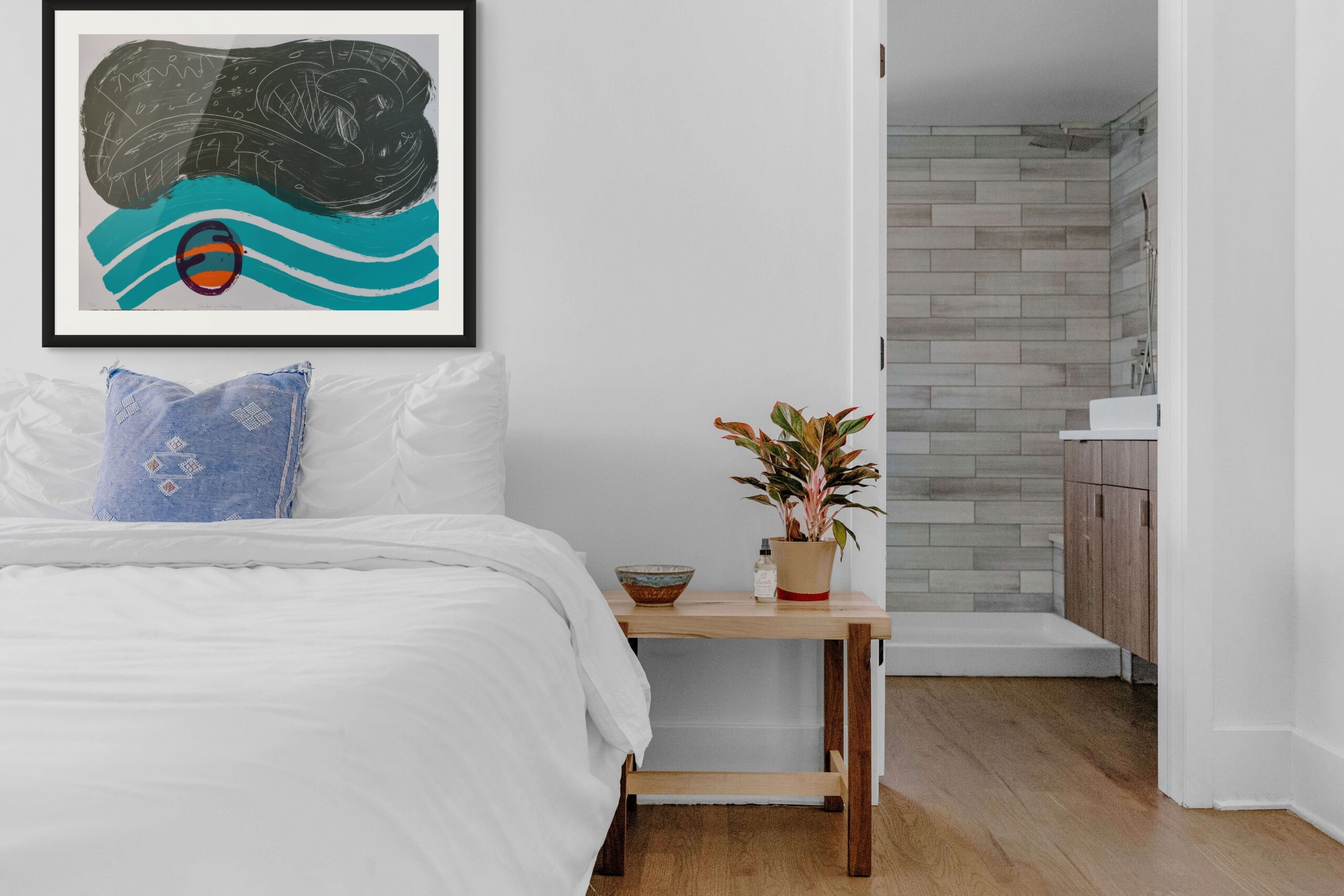 The lithograph’s title evokes tension and concealment, yet the imagery balances that with fluidity and openness. Scratched white lines pulse across the surface like codes or currents, while arcs of color suggest landforms, waves, or sonic vibrations. There is a strong sense of rhythm here—of visual jazz—echoing the vocabulary of abstract expressionism and lyrical minimalism.