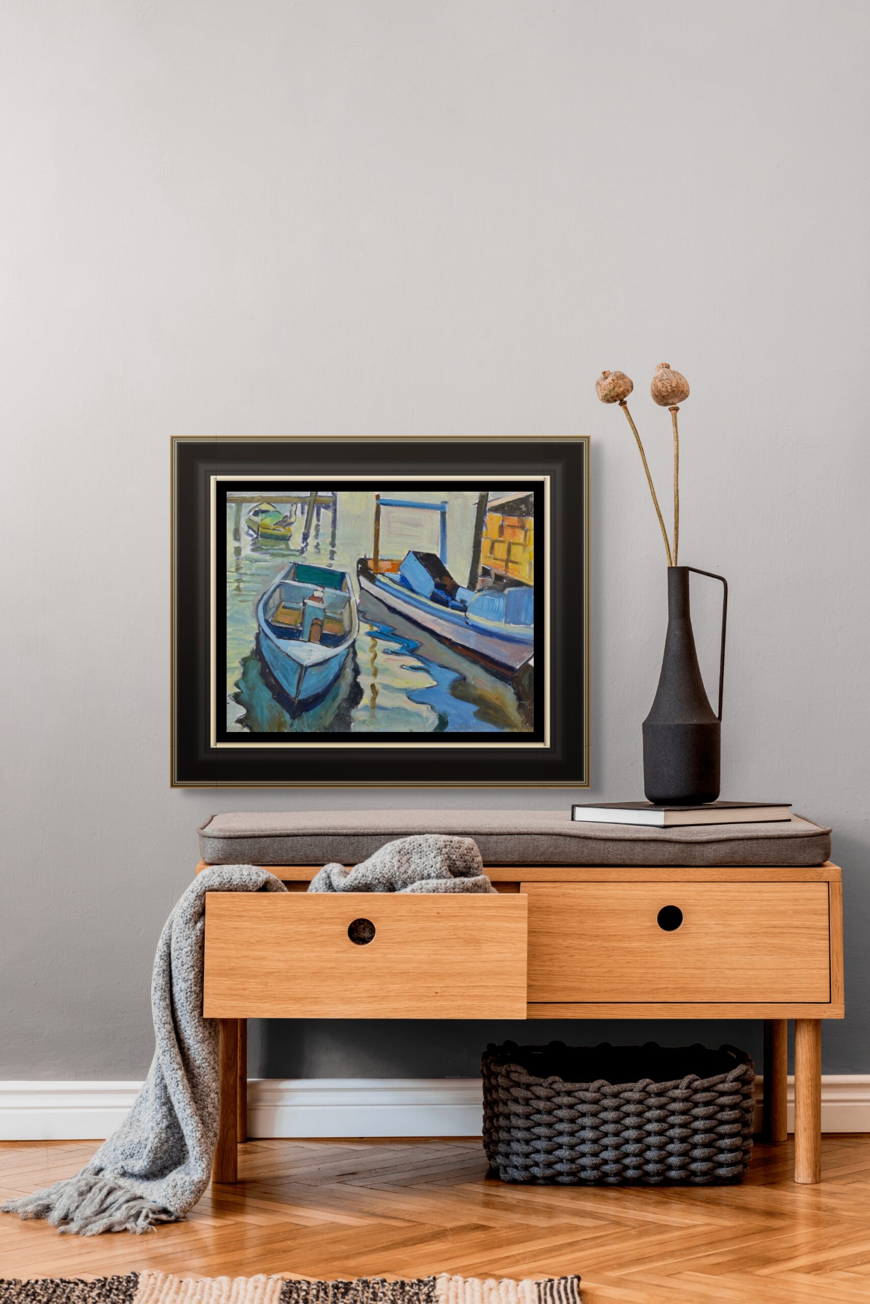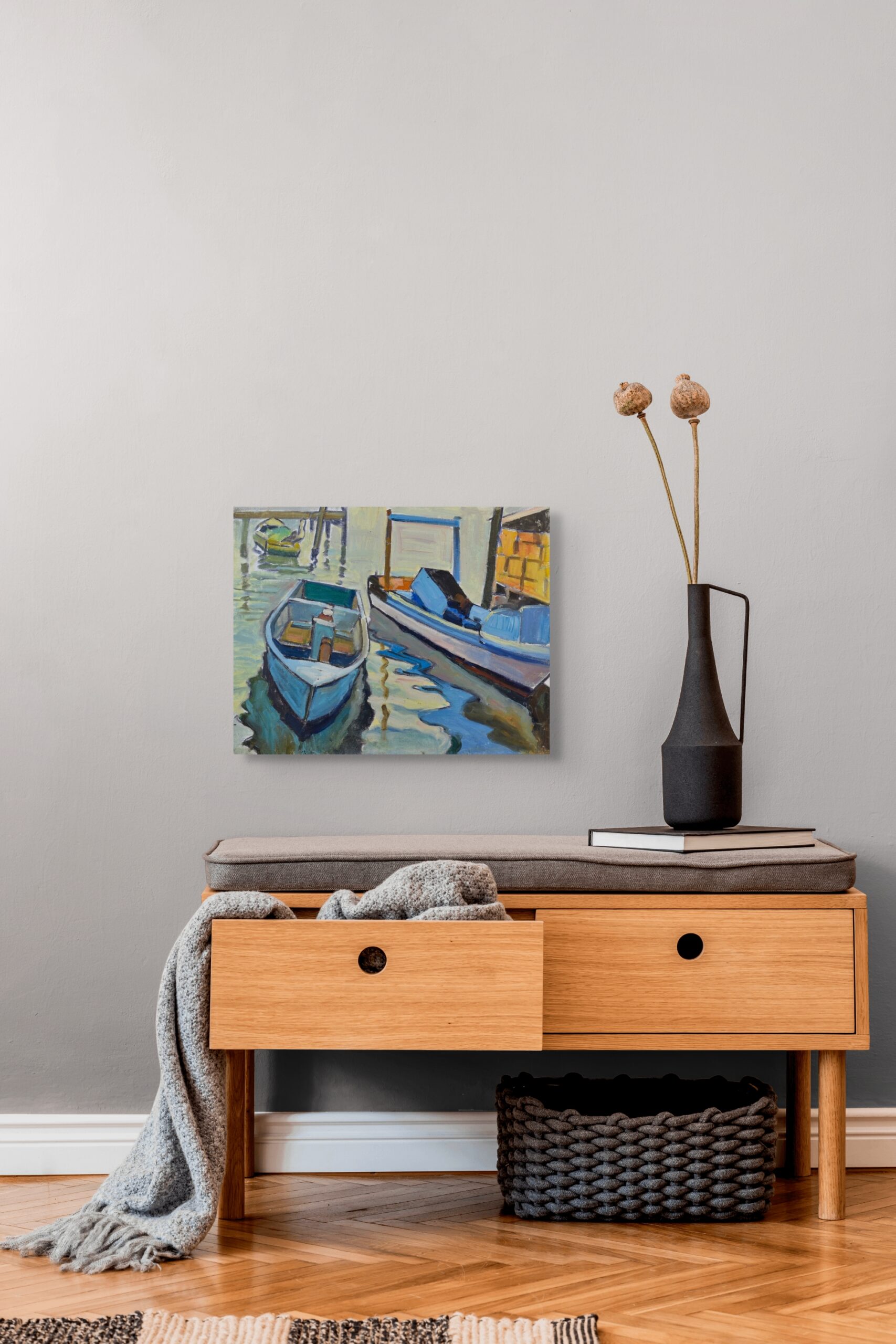 A pair of docked boats float gently in jade-green water, quiet and balanced. Zeilig’s handling here is meditative—the brushstrokes looser, the palette minimal. It feels like a morning scene, crisp and contemplative.